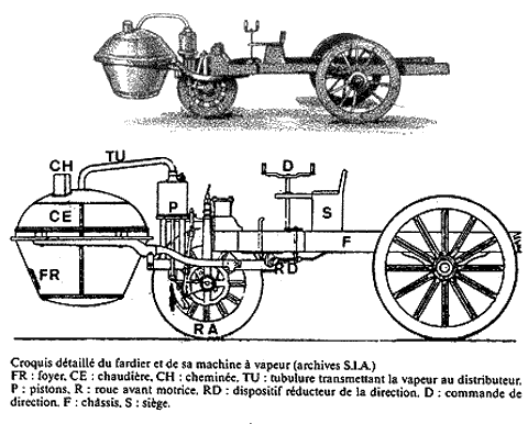 «Паровые дроги» Кюньо представляли собой огромную трехколесную телегу. Установленная на ней примитивная паровая машина при помощи сложной зубчатой передачи приводила в движение переднее колесо, снабженное шипами. Впереди, на выступающей железной раме, был подвешен большой круглый котел. Чтобы поправлять огонь и подбрасывать топливо, машинисту приходилось забегать вперед.