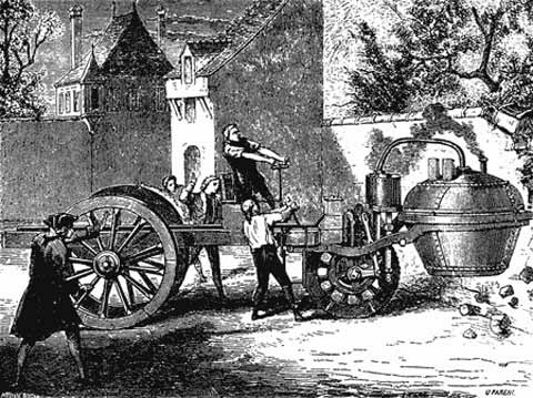 Первая практическая попытка построить повозку, передвигаемую не упряжной силой животного, а паровым двигателем, связана с именем французского военного инженера Николаем Кюньо. Уроженец Лотарингии, он в молодости оставил родину и в качестве военного инженера искал счастье при дворах драчливых германских князьков и герцогов. Кюньо строил крепости и преподавал военные науки; он же написал большой труд по полевой фортификации. Им было изобретено усовершенствованное кремневое ружье, которое маршал Саксонский ввел для вооружения своих улан. Около 1762 года Кюньо перебрался в Нидерланды и поступил на службу к Карлу — герцогу Лотарингскому, стоявшему во главе управления австрийскими Нидерландами. Здесь он впервые занялся изобретением «паровых дрог», предназначавшихся для перевозки артиллерийских орудий и снарядов.