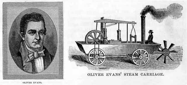 Немного позже Кюньо созданием механического экипажа занялся выдающийся американский изобретатель, «американский Уатт» — Оливер Эванс. Эванс, правильнее — Ивенс (Evans), родился в 1755 году в небольшом городке Ньюпорт в штате Делавар. Его родители имели небольшое фермерское хозяйство. Молодой Эванс предпочел променять сельское хозяйство на ремесло. Четырнадцати лет он поступил в обучение к каретному мастеру, у которого пробыл несколько лет. К этому времени относятся его первые попытки изобрести механический экипаж, который можно было бы приводить в движение без помощи животных. Однако практических результатов в этой области Эвансу удалось добиться значительно позже, когда он занялся усовершенствованием паровой машины и попытался этот двигатель поставить на экипаж.
