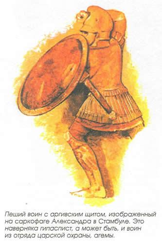 У Диодора мы находим описание армии Александра: 12 тысяч пеших и 1,5 тысячи всадников было оставлено в Европе, а 32 тысячи пеших воинов и 5100 всадников отправились в Малую Азию. Состоял этот отряд из 12 тысяч македонцев, которым были приданы для усиления 7 тысяч воинов из союзных государств, 5 тысяч наемников, 7 тысяч пехотинцев, снятых с македонских границ, и тысяча лучников и агрианских пращников. Последние были родом из гористого северного пограничного региона Македонии. Пять тысяч сто всадников включали в себя 1800 македонцев, 1800 фессалийцев, 600 греков и 900 фракийских и пеонийских разведчиков. Очень жаль, что до наших дней не дошло ни одного первичного источника по периоду Филиппа и Александра Македонского. Главным трудом, посвященным Александру, является книга Арриана, который жил на четыреста лет позже описанных им событий. Двенадцать тысяч воинов македонской пехоты, которые сопровождали Александра, состояли из девяти тысяч «товарищей», о которых уже рассказывалось, и трех тысяч гипаспистов. Те 12 тысяч, что остались в Европе, были скорее всего поделены на фалангитов и гипаспистов в такой же пропорции. Гипасписты (буквально — щитоносцы) имели несколько более легкое вооружение, нежели обычные воины фаланги, но в битве сражались бок о бок с ними. Гипаспистов обычно размещали между фалангой и конницей. Вероятно, в их функции входила защита уязвимых флангов фаланги. Похоже, что вооружены они были как обычные гоплиты — копьем и аргивским щитом. Название же их восходит, наверное, к периоду, когда они составляли отряд оруженосцев для конницы гетайров. Вероятно, полноценной боевой единицей они стали при Филиппе Македонском, однако упоминания о них ветре чаются только начиная со времен Александра. Гипасписты были организованы в отряды по тысяче человек, которые назывались хилиархии (hiliarhia). В функцию первого из этих отрядов, агемы (agema), входила охрана царя. Где-то в конце Аррианова жизнеописания Александра историк упоминает об особом отряде в армии македонского царя, который назывался «серебряные щиты» (аргираспиды), причем делает он это так, словно хочет подчеркнуть, что они являлись своего рода элитой и все о них знали. Согласно Юстину аргираспиды представляли собой отряд, составленный Александром из ветеранов его индийского похода. Диодор несколько раз упоминает об аргираспидах, рассказывая о том, что после смерти Александра они сопровождали Евмена. В 317 г. отряд состоял из трех тысяч человек и имел таких же командиров, как и гипасписты. Диодор продолжает говорить о престижности этого отряда и о том, что в нем служили воины не моложе шестидесяти лет. Здесь историк следует Иерониму Кардискому который, конечно, мог преувеличивать, но вряд ли так уж ошибался насчет возраста этих воинов — тем более что он видел их своими глазами. Так кто же были эти «серебряные щиты»? Возможно, что мы так никогда этого точно и не узнаем. Предположение, которого придерживается Тарн, утверждающий, что аргираспиды — всего лишь другое название гипаспистов, совершенно не годится, если считать, что все они и вправду были еще и ветеранами. Гипаспистов всего было три тысячи, так что набрать людей еще на один отряд такого же размера, составленный из ветеранов, можно было бы, только если они были «бессмертными». Очевидно, что аргираспидов набирали из всей фаланги.
