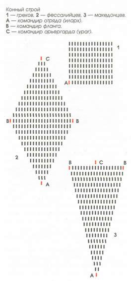 должно было составлять 210 человек, а в царском отряде — 300. Это последнее число выглядит чрезвычайно привлекательно, поскольку 300 воинов — это традиционная численность привилегированной части. В пользу такого деления говорит и тот факт, что это ровно то количество всадников, которое необходимо для построения клином. Для отрядов, размер которых варьируется от 200 до 300 человек, такими необходимыми числами являются 210, 231, 253, 276 и 300 всадников. В этом случае в остальных илах должно было быть по 210 человек. В конце первого года азиатского похода конница получила подкрепление в 300 всадников, что позволило, с учетом потерь, довести количество людей в семи илах до 321 в каждой. Очевидно, что иларх не мог рассчитывать на наличие точного количества всадников в своем отряде и наверняка оставлял промежутки в задних рядах. Преимущество такого способа построения состоит в том, что, раз прорвавшись сквозь строй противника (а это, конечно, и есть прямая задача конницы), ила могла развернуться, или, как говорит Марсден, «раздаться в стороны». Гетайры были вооружены длинными копьями, которые также называли сариссами. В ходе своих экспериментов с сариссой Маркл выяснил, что ее можно было использовать для нанесения традиционного удара сверху или брать наперевес для нанесения удара от пояса, но в ходе сражения поменять хват было невозможно, так как для этого требовались обе руки. Маркл полагает, что выстроившуюся клином конницу могли применять в качестве ударной силы против пехоты. Фессалийская конница Александра также состояла из 1800 всадников. К сожалению, нам неизвестно ни количество отрядов, на которые она делилась, ни число людей в этих отрядах, хотя мы знаем, что силы этих отрядов не были одинаковыми и ила из Фарсалы была самой большой и самой лучшей. Боевым порядком фессалийцев был ромб. Этот тип построения был введен Ясоном из Фер около 375 г. до н.э. и предполагал возможность использования конницы для прорыва. Полибий писал, что остановить атаку фессалийской конницы было невозможно независимо от того, была ли то вся масса или лишь одна ила. Однако как застрельщики фессалийцы были бесполезны. Шесть сотен греческих всадников, которые сопровождали Александра, должно быть, составляли пять ил по 128 человек в каждой — об этом сообщает писатель-тактик Асклепиодот. Они, вероятно, строились квадратом в 16 всадников в ширину и 8 — в глубину. В длину лошадь, естественно, больше, чем в ширину, а потому всадникам, выстроенным колонной, требуется в два раза больше места, чем шеренге. Построение из-за этого получалось действительно квадратное. Полибий утверждает, что число 8 было максимально возможной глубиной для квадратного боевого порядка. Он пишет, что восемьсот всадников, построенные по 8 человек в ряд, занимают пространство в одну стадию. Другими словами, на каждую лошадь в ряду отводилось по два шага. Наиболее эффективной глубиной для такого построения было 4 всадника в ряд. Как фессалийские, так и греческие всадники были вооружены копьями. Девятьсот фракийских и пеонийских конных дозорных имели на вооружении дротики. Они шли впереди армии, отыскивали засады и первыми вступали в соприкосновение с противником. Александр использовал их и в качестве застрельщиков. В описании битвы при Гранике упоминаются четыре илы балканских копейщиков. Согласно Арриану («Ис