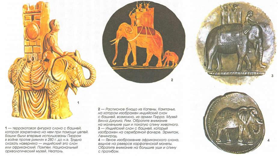 Наиболее существенным нововведением после смерти Александра были слоны. В битве при Гавгамелах у персов было 15 слонов, и именно тогда европейцы впервые столкнулись на поле сражения с этими животными. В Индии, в битве при Гидаспе, македонянам пришлось противостоять двум сотням боевых слонов. Их выстроили впереди всей армии с промежутком в 30 м, из чего можно сделать вывод, что главной целью слонов было остановить атаку конницы, поскольку лошади не выносят их запаха. Вначале легковооруженные македонские пехотинцы метали дротики, стремясь поразить погонщиков слонов. Затем Александр отдал приказ задней части фаланги выдвинуться вперед и занять промежутки между рядами для того, чтобы образовать сомкнутый щитовой строй, которому удалось оттеснить слонов массой своих копий. Так европейцы познакомились со слонами, и с тех пор каждая уважающая себя армия считала своим долгом иметь их в своем составе. Слоны еще на протяжении сотни лет считались большой диковиной, а Александр, возвращаясь из Индии, прихватил собой целых две сотни. В армиях преемников Александра слонов применяли почти исключительно против конницы. Иногда их могли использовать при осаде для того, чтобы разбирать частоколы. Промежутки в строю между животными заполнялись легковооруженными воинами. В битве при Газе (312 г. до н.э.) в каждом промежутке находился отряд из 50 метателей дротиков, пращников и лучников, причем последние составляли примерно треть от общего количества. Диодор утверждает, что таково было стандартное количество пехотинцев, приходившееся на одного слона. Известно, что самым слабым местом животного были ноги. При осаде Мегаполя в 318 г. до н.э. на пути, которым они должны были двигаться, разложили деревянные рамы с насаженными на них железными остриями, а в битве при Газе перед ними раскидывали заостренные предметы, соединенные цепями, возможно, наподобие «ежей». В 280 г. Пирр, родич Александра, вторгся в Италию. Так римляне впервые столкнулись с этими «живыми танками». Поскольку война происходила в основном в Лукании, слоны получили прозвище «луканских коров». Все упомянутые выше животные были индийскими, однако Птолемею, находившемуся в Египте, было сложно их добывать, а потому вскоре в ход пошли и африканские слоны — сначала в Египте, а затем и в Карфагене. Полибий, описывая сражение между египтянами и сирийцами при Рафии (217 г. до н.э.), упоминает, что африканские слоны были мельче индийских. Это примечание вызвало целую бурю споров, поскольку дело обстоит совсем наоборот. Это место из Полибия довольно часто цитируют, когда хотят по казать, что он был совсем не так хорошо информирован, как то провозглашают его почитатели. Однако недавно стало известно, что во времена Полибия в северной Африке водилась особая разновидность лесных слонов, до наших дней не дожившая. Рост этих животных в холке был не более 2,35 метра, тогда как индийские слоны достигали 3 м. Рассказывая о битве при Рафии, Полибий дает яркое описание сражающихся друг с другом слонов. Они встречались голова к голове, переплетали бивни и стремились надавить друг на друга всем своим весом. В конце концов один из противников отводил в сторону голову другого и вонзал бивни в открывшийся бок. Индийцы, с которыми сражался Александр, не ставили башни на своих слонов, хотя те и были достаточно велики для эт
