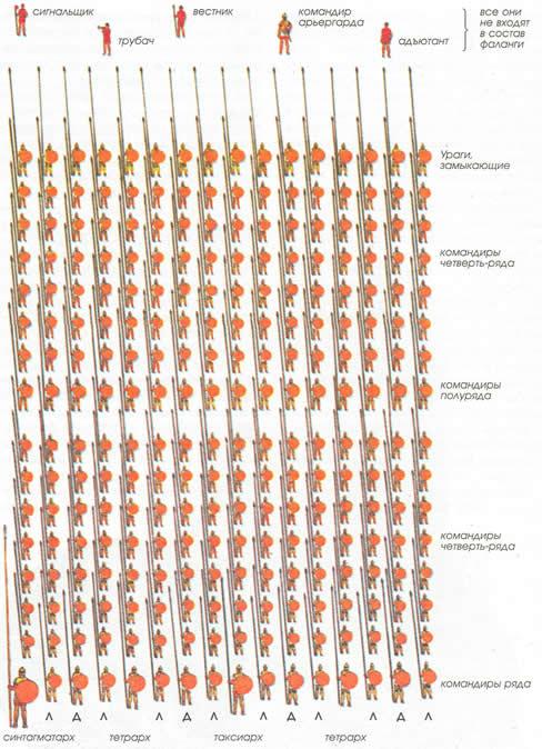 Если следовать обычной для греков практике, то можно предположить, что синтагматарх командовал правой половиной своей боевой единицы, а его подчиненный, таксиарх, — левой. Каждый таксис делился, в свою очередь, на две тетрархии, которыми командовали тетрархи. Каждая тетрархия состояла из двух дилохий, или сдвоенных рядов. Командир дилохии назывался дилохит (dilochites). И, наконец, каждым рядом, или лохом, командовал лохаг. Если вы взглянете на схему, помещенную на этой странице, то увидите, что все эти командиры стояли в первой шеренге (то есть были protostatai — протостаты). В каждом ряду (лохе) был командир полуряда — гемилохит (hemilochites), два командира четверть-ряда — эномотархи и замыкающий - ураг. Интересно посмотреть, как уменьшилась теперь обычная греческая единица, лох, и все ее подразделения. Пентекостия называется теперь гемилохион (полулох); эномотия все еще существует, но состоит всего из четырех человек. Личные звания шли последовательно, начиная от переднего (протостат) и завершая последним в ряду (epistates — эпистат). Полный ряд из 16 человек состоял соответственно из лохага (1), эпистата (2), протостата (3), эпистата (4), эномотарха (5), эпистата (6), протостата (7), эпистата (8) — он же являлся замыкающим полуряда, хемилохита (9), эпистата (10), протостата (11), эпистата (12), эномотарха (13), эпистата (14), протостата (15) и урага (16). Различали передних и задних эномотархов и эпистатов, так что каждый человек мог назвать свой ранг и место в ряду. Каждый человек в фаланге стоял так, что с обеих сторон от него были люди с таким же местом в ряду и званием — командир рядом с командиром, эпистат рядом с эпистатом и так далее. Асклепиодот объединяет две синтагмы в пентекосиархию (pentekosiarhia), командовал которой пентекосиарх. Затем он просто удваивает ее для того, чтобы получить хилиархию (chiliarchia), командир которой именуется хилиарх. Две хилиархии образуют мерахию (merachia) — под командованием иерарха. Асклепиодот добавляет также, что эта боевая единица, состоявшая из двух тысяч сорока восьми человек, называлась раньше крылом (keras) или отрядом (telos). На основании этого можно сделать вывод, что именно они и составляли фалангу в более ранний период. Тот же факт отражен и в названии удвоенной иерархии — фалангархия, командовал которой фалангарх (тот, кто изначально был стратегом). Сдвоенная фалангархия образовывала крыло (керас) под командованием керарха, а два крыла формировали фалангу, которой командовал стратег. Автору кажется разумным представить данное описание хотя бы для того, чтобы избавить читателя от необходимости работать с источниками, однако следует предупредить его, что такой фаланги, быть может, никогда и не существовало. Большая часть подразделений и командиров, стоявших выше синтагмы, в большой степени гипотетичны — они появились в результате поиска и реконструкции всех возможных имен, а затем использовались для того, чтобы создать математически четкую модель фаланги.