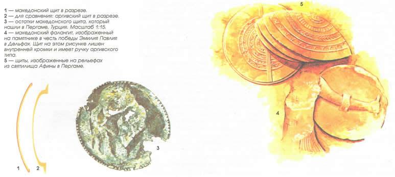 В 1934 и 1935 годах были опубликованы отрывочные записи македонских военных уложений, обнаруженных в Амфи-поле. В этих надписях, которые датируются временем правления Филиппа V, т.е. 221 —178 гг. до н.э., перечислены, помимо всего прочего, и штрафы, которые налагались за потерю снаряжения и другие дисциплинарные проступки — вроде сна на посту. В них же фигурируют названия нескольких низших командирских званий и боевых единиц. Однако ни там, ни у Полибия мы не встречаем слова «синтагма». У греческого историка, однако, постоянно упоминается единица, именуемая «спейра». Этот же термин он использует для римского манипула, который, как известно, был самой мелкой тактической единицей легиона, то есть занимал то же самое положение, что и синтагма в Асклепиодотовой фаланге. В надписи из Амфиполя спейра или ее командир, спейрарх, упоминаются не сколько раз. В отношении греческих армий термин «синтагма» никогда не употребляется, но его упоминают в документах, относящихся к эллинистическим армиям вне пределов Европы. Спейра, в свою очередь, никогда не упоминается за ее пределами. Все сказанное выше позволяет сделать вывод, что спейра была греческой версией синтагмы. В амфиполисской надписи постоянно встречаются упоминания о тетрархах и спейрархах в таком контексте, из которого следует, что первые непосредственно подчинялись вторым. Фейял, публикатор второй части амфиполисского военного устава, заключил свой комментарий к этому месту из него предположением, что спейра состояла из четырех тетрахий, каждая из которых, в свою очередь, делилась на четыре лоха. Такое мнение представляется вполне разумным, а следовательно, подвергает сомнению факт существования промежуточных командиров — таксиархов и дилохитов, упоминаемых у Асклепиодота. Вероятно, та часть структуры македонской фаланги, что располагалась выше спейры, также состояла из четверок — т.е. четыре спейры формировали более крупную часть (возможно, ее именовали хилиархия), а четыре такие части образовывали стратегию под командованием стратега. Делая подобные предположения, Фейял основывается на другом месте из амфиполисского уложения, где говорится о трех командных должностях, которые, как представляется, образуют иерархическую структуру. Речь идет о грамматее, архиперете и гиперете (grammateus, archyperetes, hyperetes). Поскольку нам известно, что гиперет являлся тыловым офицером синтагмы спейры, архиперет должен был исполнять те же функции в следующем по величине соединении (хилиархии), а грамматей соответственно — в стратегии. Единственная проблема, которая возникает, если мы примем за основу стратегию, состоящую примерно из четырех тысяч человек, состоит в том, что перед нами вновь появится Асклепиодотова формула. Как именно можно разделить на два крыла фалангу в десять тысяч человек — основную военную силу как Антигона Досона, так и Филиппа V У античных авторов упоминаются два военных соединения, ни одно из которых невозможно четко определить — совсем как аргираспидов Александровой армии. У исследователя вновь возникает чувство, что буквально все в древности знали, что представляют собой эти соединения, и потому никто не считал нужным тратить силы на объяснения. Первая из этих таинственных боевых единиц называется «медные щиты», а вторая — «белые щиты». Полибий упоминает о них в рассказе 