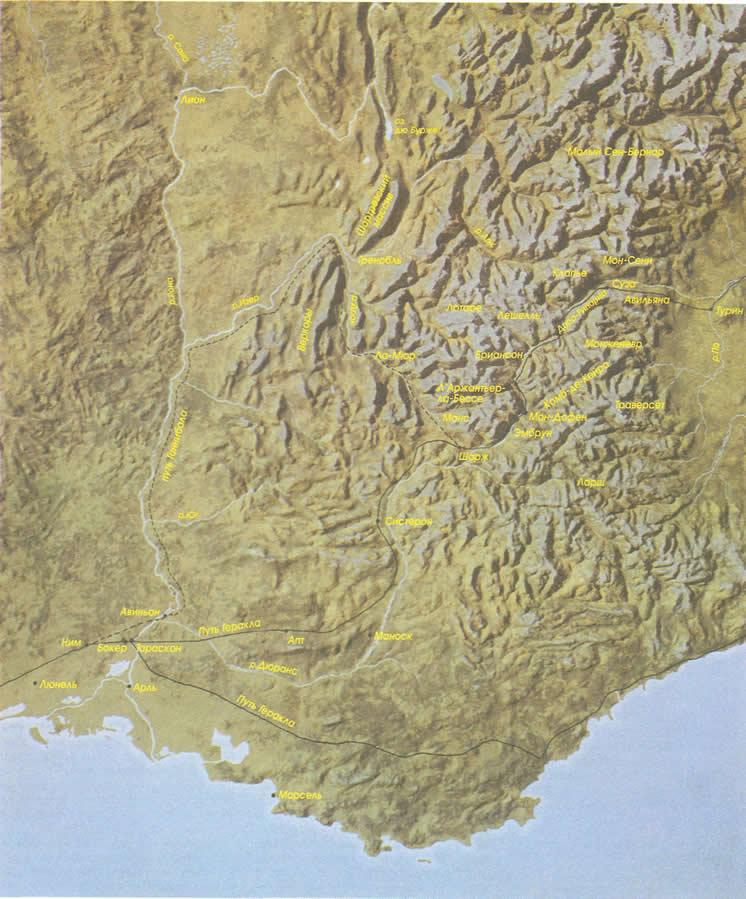 Во времена Ганнибала существовало два главных пути, связывающих Италию и Испанию. Они были известны древним как легендарные «пути Геракла». Один из них шел из Тосканы вдоль лигурийского побережья. Другой проходил через Альпы, начинаясь в долине По. Две дороги встречались на Роне, которую пересекали у Бокер-Тараскона, а затем шли вдоль побережья Испании. Около 118 г. до н.э. путь через Альпы в Испанию сменился на римскую Домициеву дорогу. Возникает вопрос: был ли путь Геракла и Домициева дорога одним и тем же? Нелепо было бы предполагать, что римляне, строя Домициеву дорогу, проложили через Альпы совершенно новый путь. Такая затея не имела бы никакого практического смысла и была совершенно не в духе римлян. Самый простой и удобный путь через горы уже был проложен купцами и странниками, которые путешествовали там веками. Римляне же, видимо, просто выровняли и замостили его. Эта дорога была самым низким, самым широким и самым удобным перевалом через Альпы. К тому же это был кратчайший путь в долину р. По. Расстояние по Домициевой дороге от Нима, который находится к западу от Роны, до Казале Монферрато, расположенного в долине По, где сходились все пути, составляет 481 км. Кратчайший путь через Коль-де-Ларш равен примерно 500 км, а путешествие вверх по долине Изера, через перевалы Малый Сен-Бернар, Клапье или Мон-Сени, увеличит расстояние более чем до 600 км. Это все низкие перевалы, что есть в западной части Альп. Благодаря этим данным, ясно, что путь по Домициевой дороге был самым предпочтительным. Исходя из этих же соображений, так же должен был следовать и путь Геракла. Дорога из Тараскона усеяна кельто-лигурийскими городами и крепостями-оппидумами. Сегустерон (Систерон), Катургий (Шорж), Эбуродунум (Эмбрун), Бригантий (Бриансон) к западу от перевала и Сегузион (Суза) к востоку от него — все это кельтские имена, а следовательно, они существовали еще до того, как римляне построили свою дорогу. Есть оппидумы и близ Апта, и Мон-Дофен и еще два между Маноском и Систероном. Все эти факторы дают исчерпывающие доказательства того, что на месте Домициевой дороги проходил путь еще до римских времен. Подтверждает это и псевдо-Аристотель, живший во второй половине III в. до н.э. — во времена Ганнибала. Он пишет, что при переходе через Альпы приходится платить пошлину живущим вдоль тракта кельто-лигурийцам. Вероятно, что относится это заявление к тому самому южному пути, поскольку лигурийцы как-то плохо вяжутся с северной дорогой. Таким образом, можно утверждать, что существовал хорошо известный путь из Испании в Италию, который проходил через Альпы. Путем этим пользовались во времена Ганнибала, и шел он там же, где и римская Домициева дорога.