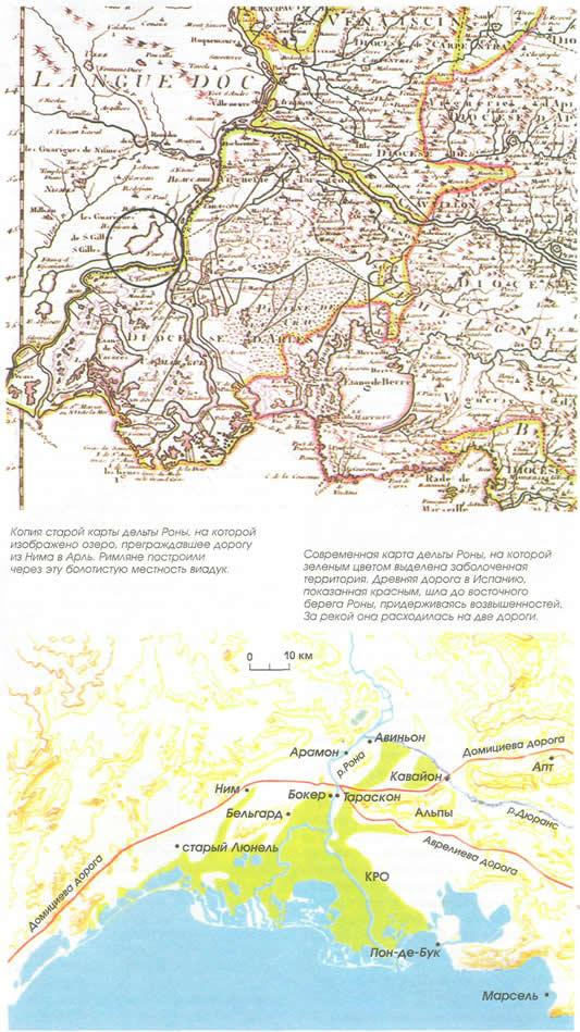 Несомненно, планируя вторжение в Италию, Ганнибал намеревался перейти через Альпы и добраться до долины По по пути Геракла. Зимой 219—218 гг. до н.э. он договорился с племенами, живущими вдоль него, и заплатил им за проход. О походе Ганнибала через Пиренеи нам практически нечего сказать, а вот о том, как его армия двигалась через южную Галлию, кое-что известно. Полибий писал, что дорога от Испании до реки Роны была тщательно измерена римлянами и размечена верстовыми столбами. Благодаря этому замечанию историк, сам того не ведая, предоставил будущим исследователям очень ценную информацию. Благодаря ему мы узнаем, что Ганнибал шел по тому пути, которым позднее стали пользоваться римляне. Констатирует он и тот факт, что римляне, как обычно, замостили и измерили существовавший задолго до них тракт, когда строили знаменитую Домициеву дорогу к западу от Роны. Упоминание о промерах дороги привело к своего рода противоречию, поскольку известно, что осуществил его Гней Домиций Агенобарб («Рыжебородый») в 118 г. до н.э., дата, очень близкая ко времени смерти Полибия. Многие ученые все-таки полагают, что отрывок этот аутентичен и историк сам вставил его в текст незадолго до смерти (см., например, работу Ф. Уолбанка «Комментарии к Полибию», т. 1, стр. 373, и т. 3, стр. 768). Следы римской дороги можно ясно увидеть на восточном берегу Роны, между Монпелье и Нимом. Она идет вдоль гребня возвышенности, огибающей прибрежные болота, примерно в девяти километрах от современной береговой линии. Это ничуть не удивительно, особенно если принять во внимание климатические условия того времени, о которых говорилось выше. Даже в наши дни побережье в тех местах топкое, а береговая линия постоянно меняется, потому что Рона приносит примерно 20 миллионов тонн наносов в год. Большая часть ила относится в западном направлении и образует отмели и лагуны вдоль побережья до самой Испании. В древние времена береговая линия могла быть значительно ближе к дороге. Полибий указывает расстояния, которые проходила армия Ганнибала. Цифры эти, к большому сожалению, весьма приблизительные, даны с большим разбросом и требуют поправки на каждые 200 стадиев. Если сложить те расстояния, что отмечены у Полибия для каждой отдельной части маршрута, получится, что Новый Карфаген отделяет от Италии расстояние в 8400 стадиев. Сам Полибий, однако, говорит о 9000 стадиев. Вероятно, что промежуточные цифры, данные везде приблизительно, соблазнили его увеличить общий итог, округлив его. Описывая дорогу от Испании до Роны, Полибий пишет также, что римляне поставили на ней дорожные столбы через каждые восемь стадиев. Все расстояния, которые дает Полибий для рассказа о событиях 218— 217 гг., указаны в цифрах, кратных восьми стадиям. Следовательно, он пользовался неким римским источником, считая одну милю равной восьми стадиям (т.е. 200 стадиев примерно равны 37 км), а не восьми с одной третью, как исчисляли ее многие. В данной работе я пользуюсь системой Полибия. Историк сообщает нам, что Ганнибал пересек Рону там, где она течет единым руслом, на расстоянии четырехдневного перехода от моря. Еще он указывает на большое количество лодок, которое Ганнибал смог купить для своего войска.
