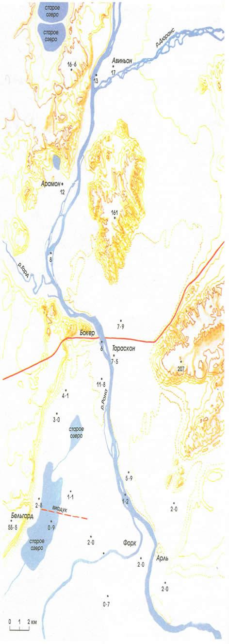 Карта Роны выше дельты, на которой показаны возможные места переправы. До строительства римского виадука переправа к югу от Бокера—Тараскона была невозможна.