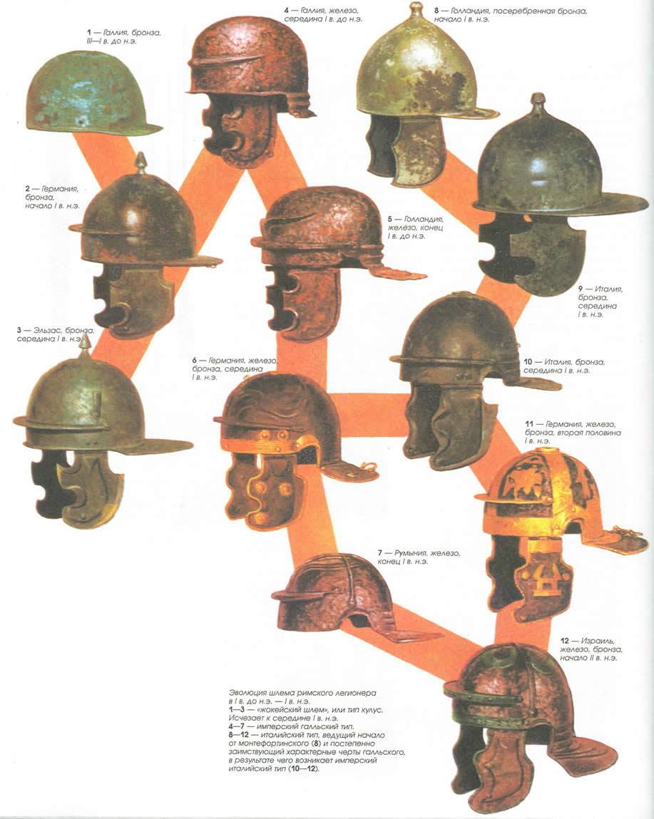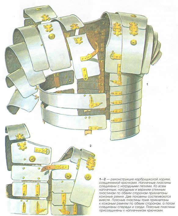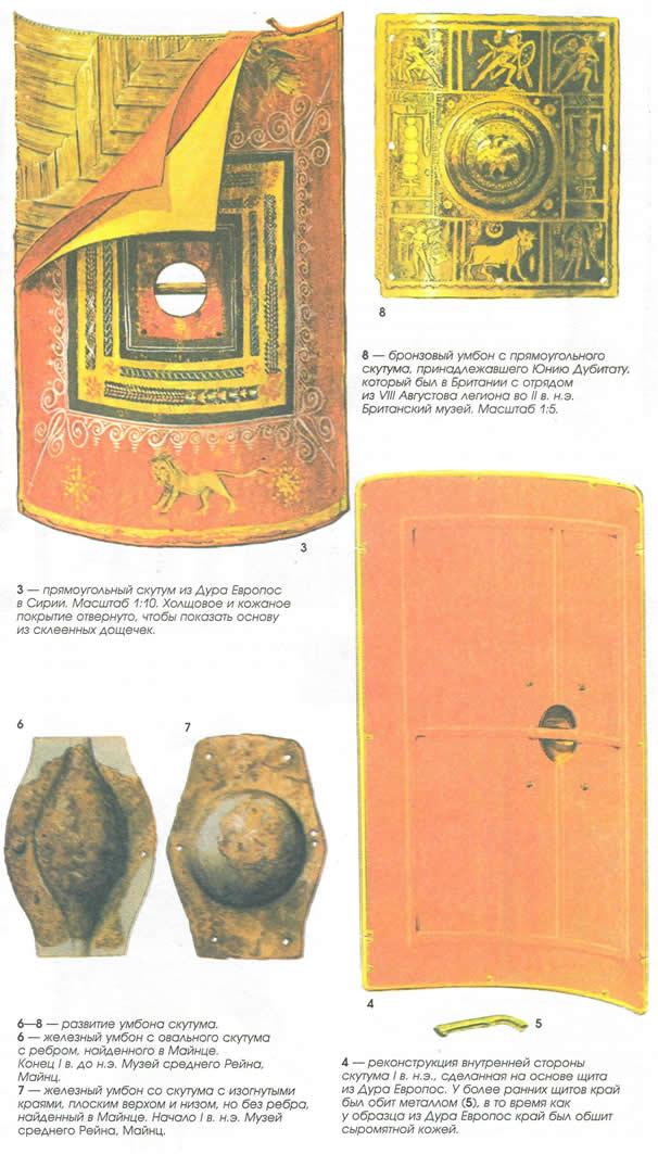 Ему удалось убедительно показать, как они были устроены. Существовало два способа прикрепления грудных и верхних спинных пластин к нижней части доспеха. В одном варианте они скреплялись крючками, в другом (здесь он не приводится) — ремнями и пряжками, которые спереди располагались снаружи, а на спине — внутри доспеха, так что, видимо, сперва доспех наполовину собирался, потом надевался, и остальные пряжки застегивались уже на себе. На лориках обоих типов левая и правая нагрудная и верхняя спинная пластины соединены ремнями с пряжками. Сегменты нагрудной и наплечной частей соединены декоративными петлями. На одном из образцов петля сломана, и две пластины просто склепаны вместе, так что, видимо, петли действительно были чисто декоративными и не имели практического смысла. Фрагменты из Ньюстида, датируемые примерно тем же временем (конец I в.), петель, по всей видимости, не имели. Узкие полосы на плечах, поясе и верхней части спины были приклепаны к кожаным ремням, и поясные пластины стягивались вместе спереди и сзади. Реконструированные лорики весят примерно килограмм девять. Первоначально предполагалось, что эти доспехи относятся ко II в. н.э., но фрагменты подобных доспехов были найдены во многих более ранних поселениях. Крючки с поясных пластин, приклепанные к железу, встречаются среди предметов, недвусмысленно указывающих на первую половину I в. Другое важное обстоятельство состоит в том, что подобные фрагменты находят отнюдь не только на месте легионных лагерей. Становится все более очевидным, что сегментированную лорику носили далеко не только легионеры. В начале I в. н.э. овальный скутум был замещен более коротким прямоугольным щитом, который сохранил прежнее название. Поначалу это был все тот же овальный скутум, только обрезанный сверху и снизу, но постепенно и боковые края тоже сделались прямыми. Единственный сохранившийся экземпляр такого щита найден в Дура Европос в Сирии и датируется III в. н.э. Этот щит имеет точно такую же конструкцию, как и фаюмский щит: он склеен из трех слоев платановых дощечек примерно 2 мм толщиной, наклеенных крест-накрест, так что образуется изогнутый кусок фанеры. Изнутри щит укреплен полосками дерева, тоже наклеенными. Ручка образуется утолщением средней полоски. Щит обтягивался кожей, а поверх кожи — холстиной. Края обшивались сыромятной кожей, пришитой к дереву. Этот щит куда легче и менее прочен, чем фаюмский и латенский образцы, которые почти в два раза толще в середине. Богатые украшения на щите и тот факт, что он был сделан во времена, когда прямоугольный скутум уже почти вышел из употребления, видимо, говорят о том, что это был традиционный церемониальный щит. В бою он однозначно никогда не использовался. В связи с этим можно вспомнить преторианцев, которые в конце I в. н.э. по-прежнему выходили на парад с овальными скутумами. В I—II вв. н.э. край прямоугольного скутума, как правило, укреплялся бронзой. Найдено множество обломков такой оковки, и они доказывают, что щит действительно был около 6 мм толщиной. Но, вероятнее всего, щит, как и в более ранний период, укреплялся дополнительно, так что его толщина в середине была около сантиметра. Реконструкции прямоугольного скутума, сделанные на основе щита из Дура Европос, с добавлением бронзовой оковки и железного умбона, весят 5,5 кг. Если в середин