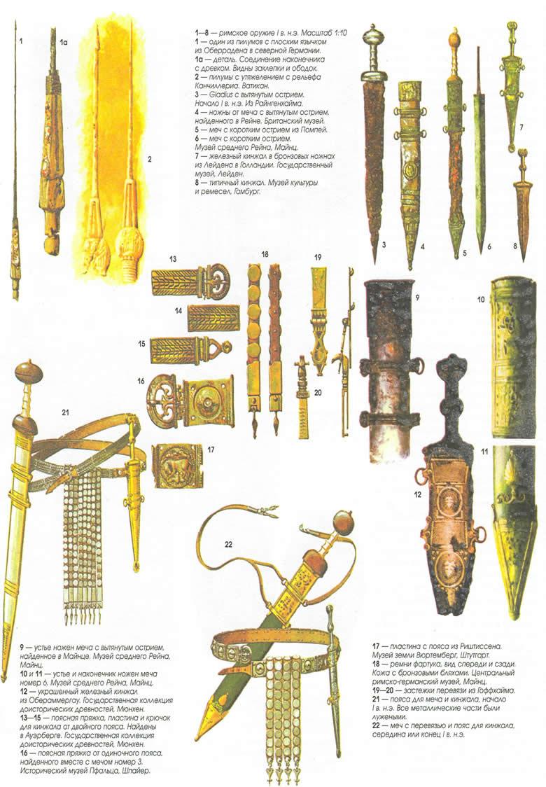 Увы, по вооружению и доспехам I в. до н.э. сведений у нас очень мало. Существует лишь одно скульптурное изображение, на котором показаны именно легионеры эпохи поздней республики. Этот памятник, известный как алтарь Домиция Are нобарба, найден в неизвестном здании в Риме и, вероятно, восходит ко временам Мария. Сам алтарь находится теперь в Лувре, в Париже. На нем изображена группа солдат, по-видимому, увольняемых из армии. Группа состоит из четырех легионеров и офицера, вероятно, трибуна. Легионеры одеты в кольчуги, все еще воспроизводящие форму греческого льняного панциря, и имеют при себе овальные щиты, видимо, идентичные тем, что использовались во времена Полибия. На одном из них шлем монтефортинского типа, на трех других — итало-коринфского типа. На всех шлемах — длинные гребни из конского волоса, но отсутствуют перья. Поножей ни на ком нет. Среди археологических находок доспехов того периода не обнаружено, но несколько шлемов до нас дошли. Солдаты приобретали доспехи на собственные средства, а потому легковооруженные велиты набирались из беднейших слоев населения. Когда Марий открыл доступ в легионы всем гражданам, невзирая на их состояние, армии пришлось взять вооружение новобранцев на себя, тем более что теперь всем требовалось снаряжение тяжелого пехотинца. Поэтому власти развернули массовое производство дешевых доспехов, оплачиваемых из солдатского жалованья. Об этом говорят сохранившиеся образцы шлемов того периода. Шлемы повреждены, часто покорежены. Практически все дошедшие до нас образцы относятся к монтефортинскому типу и очень похожи на те, что изготовлялись ранее, но сделаны грубее. При изготовлении шлемов использовались всевозможные упрощения технологии: так, к примеру, петли, на которых держатся нащечники, зачастую крепятся одной заклепкой вместо положенных двух. В ленинградском Эрмитаже хранится шлем итало-коринфского типа, относящийся, видимо, к тому же периоду. На офицере с алтаря Агенобарба — короткий панцирь, итало-коринфский шлем и поножи. Он вооружен круглым щитом, копьем и мечом, который он, видимо, носит слева. Под панцирем надета туника, по-видимому кожаная, с птеригами (полосками кожи или ткани, защищающими плечи и бедра), свисающими с пояса и с плеч. Это был традиционный доспех эллинистического офицера, надевавшийся поверх форменной туники. В Лувре имеется скульптура, на которой видна одна из таких кожаных туник с птеригами, развешенная на дереве. Офицер опоясан перевязью, завязанной спереди, с концами, заправленными под перевязь. Это греческий символ высокого ранга. Такую же перевязь мы видим на Александре (стр.72). Офицеры, изображенные на колонне Траяна, одеты примерно так же, из чего можно сделать вывод, что римляне полностью переняли греческую форму для своих старших офицеров. Во время французских раскопок 60-х гг. XIX века на месте осады Цезарем Алезии было найдено немало оружия, среди которого несколько наконечников пилумов и кинжал. Фрагменты меча были найдены в Испании, в Осуне, которую Цезарь осаждал в 46 г. до н.э. Меч поддается достаточно полной реконструкции. Он остроконечный, клинок длиной 64—65 см, с легким перехватом. Он такой же длины, как мечи из Смихеля, но при этом на 1 см шире. Хорошо сохранившийся пилум с плоским язычком (около 80 г. до н.э.) найден в Валенсии в Испании. Боковины язычка не 
