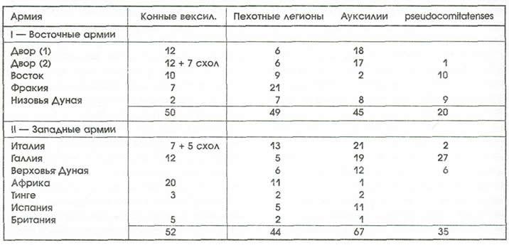 Как мы уже видели, Константин разделил армию на мобильные части (comitatenses) и пограничные войска (limitanei). Последние с помощью более мелких отрядов, стоящих в маленьких укрепленных пунктах (burgi), разбросанных вдоль всех границ, охраняли крепости и города в пограничной зоне. За некоторыми исключениями, эти войска состояли из частей нового типа, включающих в себя отряды equites (всадников), кое-где на Дунае сокращенные до cunei (эскадронов, букв, «клинья») и ауксилий, либо легионов старого типа, ал и когорт. Археологи находят все больше доказательств, что позднеримские крепости, или по крайней мере их гарнизоны, часто были меньше, чем их предшественники эпохи ранней империи. О диоклетиановской але, насчитывавшей, по всей видимости, не более 116 (или 118) человек, уже говорилось; из того же самого источника можно сделать вывод, что легионные Equites Promoti состояли из 77 солдат, Equites Sagittarii («конные стрелки») — из 121 солдата, XI когорта хамавов (германское племя) насчитывала 164 человек, и в каждом из двух легионов было около тысячи солдат. Эти пограничные войска IV века группировались в армии, занимающие одну или больше провинций, под командой «вождя» (дук, dux, позднее «duke», то есть «герцог»), за исключением большей части Африки, где «границы» (горные массивы либо полупустынные земли) делились на сектора, за которые отвечали praepositi limitis («наместники границ»), над которыми стоял comes (комит, буквально — командир, ср. современное «count», «граф») с мощной мобильной армией.