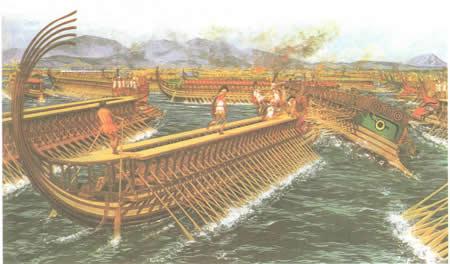 Битва при Соломине. Греки отступают в центре, заманивая персидский флот все глубже в узкий пролив — туда, где был бы бесполезен огромный мореходный опыт финикийцев.
