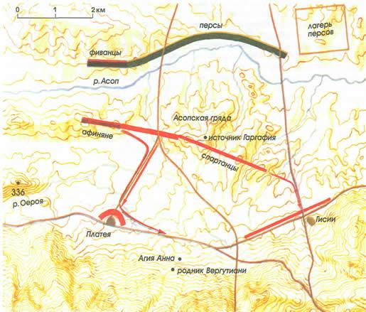 Схема отхода греческого войска от Асопской гряды. Лакедемоняне стояли на правом крыле, афиняне заняли левое, а остальные греки — центр. Было, вероятно, задумано, что афиняне будут отходить по дороге на Платею, спартанцы — по дороге на Гисии, а те греки, что стояли в центре, — через проход Три Вершины. Центр начал отступать первым, и в темноте войско свернуло не на ту дорогу, оказавшись в итоге у Платеи. Когда рассвело, афиняне, все ночь прождавшие спартанцев, несмотря на то что стояли дальше всех, попытались заполнить пространство между спартанцами и остальными греками у Платеи.