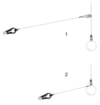 Рис. 7. Расположение «прищепок» на тросе даунриггера: 1 – при ловле в толще воды; 2 – при донной ловле.