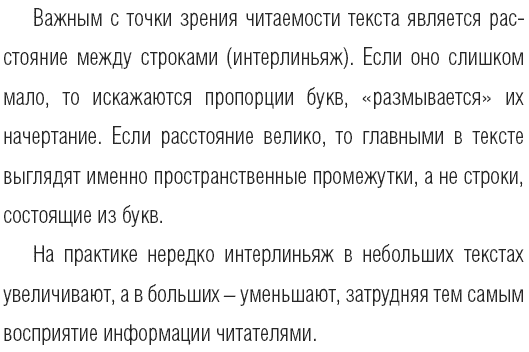 Важным с точки зрения читаемости текста является расстояние между строками (интерлиньяж ). Если оно слишком мало, то искажаются пропорции букв, «размывается» их начертание. Если расстояние велико, то главными в тексте выглядят именно пространственные промежутки, а не строки, состоящие из букв. На практике нередко интерлиньяж в небольших текстах увеличивают, а в больших – уменьшают, затрудняя тем самым восприятие информации читателями.