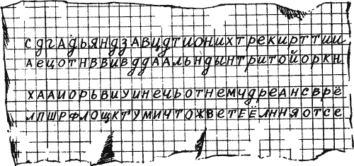 Попробуем прочесть записку через одну букву: «сгдяда…» — не годится. Шифровал, определенно, Витька, больше некому, а уж он придумает что-нибудь посложней. Через две буквы… «саязц…» — какая-то тарабарщина! Через три, четыре и пять букв… Через одну, затем — через две, через три… ни одного нормального слова!