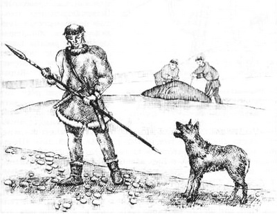 Чукча, отпугивающий копьем собаку (XIX в.).