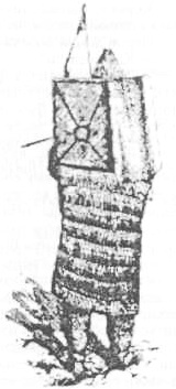 На голове воина шапка из шкуры с головы волка с бобровой оторочкой по краям, к ушам скальпа прикреплены красные ленточки с кораллами. Воин одет в зимнюю одежду: белая кухлянка из зимней шкуры оленя с черной собачьей оторочкой и воротником, подол оторочен мехом росомахи; верхняя кухлянка надета поверх нижней; меховые штаны из камусов надеты поверх других — нижних — штанов; на ногах меховые торбаса с подметками из черного межкопытного меха оленей; на руках рукавицы из оленьего камуса. Из вооружения видим горизонтально притороченное к саням копье (длиной 2,5 м) с покрытым меховым чехлом наконечником; в нартах позади ездока — лук в налучье и колчан со стрелами; на поясе с пряжкой слева — длинный однолезвийный тесак, а справа — более короткий нож. Воин сидит на оленьей шкуре в передней части нарт, опираясь ногами на полозья, позади него лежит мешок с провизией, сложенный аркан, могла быть и сменная обувь. Нарты — ездовые семикопыльные, с тормозом у правого полоза. Сани тянут два оленя (шкура у них зимняя) с обрубленными, чтобы не бодались, рогами. Правое животное находится немного спереди, оно — ведущее. Чукча управляет оленями с помощью двух поводьев, закрепленных на недоуздке, на котором у ведущего оленя имеются стимулы — две «гребенки» (на лбу и под подбородком). Воин погоняет оленей полутораметровым ивовым кнутом, имеющим поперечный наконечник из кости