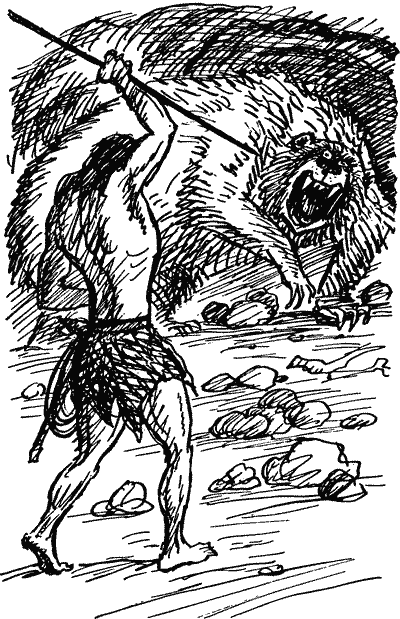 В темноте он едва разглядел зверя. Это был огромный пещерный медведь. Кер прицелился и всадил в него копьё. Зверь взревел и пошёл на юношу. Тяжёлый удар лапой отбросил охотника в глубь пещеры. Но медведь тоже упал.