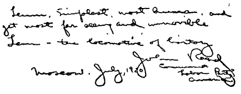 Факсимиле записи Д. Рида о В. И. Ленине (Москва, июль 1920 года). «Ленин — такой простой, такой гуманный и в то же время такой дальновидный и непоколебимый. Ленин — локомотив истории».