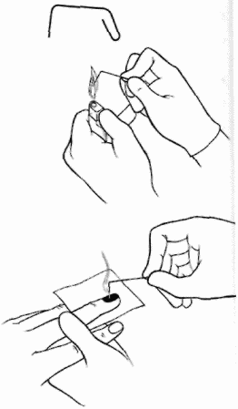 ► если на ногте есть трещина, если часть ногтевой пластинки отслоилась, попытайтесь вернуть ее в естественное положение и зафиксировать бактерицидным лейкопластырем 12.2.4.1./стр. 365.