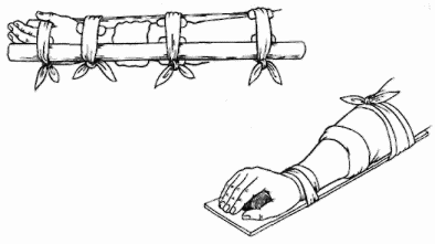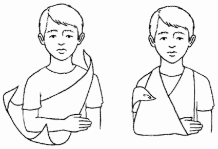 При повреждении руки — использовать косынку и прибинтовать поврежденную руку к туловищу.