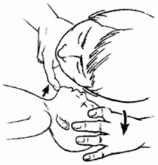 Нос при дыхании рот в рот закрыт (рука на лбу, большой и указательный палец сжимают ноздри ребенка).