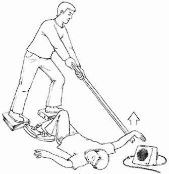 ► электрический провод можно отбросить (отодвинуть) от пострадавшего с помощью подручных средств, которые не проводят электрический ток — бумажных, деревянных, резиновых, тканевых: деревянная палка, рулон бумаги, резиновый сапог, свернутый тканевый коврик и т. п.;