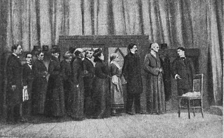 Но свою работу в направлении сатирической трактовки пьесы Вахтангов еще не доводит до конца. Образы приобретают черты гротеска. И появляется в этих людях что-то кукольное, что-то подчеркнутое, механическое, напоминающее вахтанговского Текльтона. Но у них нет ни его глубины, ни сложности, а у режиссера пока не хватает решительности… Гром разразится много позже…