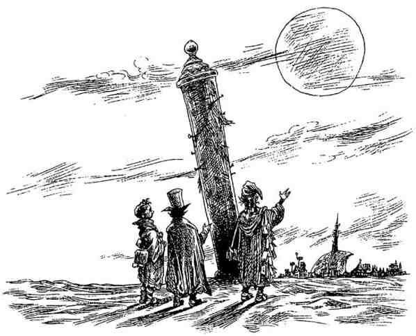 — Нам сюда, — сказал Плут некоторое время спустя, когда он вёл их по лабиринту сточных труб. Он направлялся к верхнему тоннелю в плавучих доках, через который в случае паводка сбрасывали воду прямо в Реку Края. Конечно, это был кружной путь до Дороги через Великую Топь, но, как считал профессор, наиболее безопасный, поскольку над ним располагались только молы и пристани. Один за другим все трое вышли на поверхность уже на закате, в неверной игре теней. Вечер был прохладным, и это удивило Плута.
