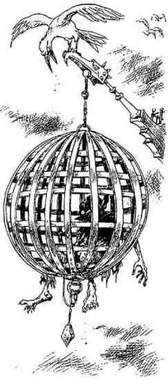 Он не отрываясь смотрел на висящую клетку. Она представляла собой полую сферу из переплетающихся обручей и планок, которая болталась, как на рее, на портале сигнальной башни. Внутри этого шара сидел мертвец. Руки и ноги его были неестественно согнуты, свесившаяся набок голова утопала в тени. Огромная стая белых воронов, к которой присоединялись всё новые особи, ожесточённо хлопая крыльями, кружила рядом с клеткой, пытаясь примоститься на прутья и просунуть жадные клювы сквозь решётку, чтобы отщипнуть кусочек гниющей плоти.