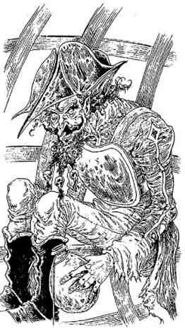 Плут медленно встал и, виляя в проходах между койками, добрался до края площадки. И там, прямо перед собой, он увидел две висящие в воздухе клетки. У мальчика кровь застыла в жилах. В первой находился побелевший от времени скелет. Одна костлявая рука была протянута сквозь прутья решётки, как бы прося подаяния, а оскалившийся череп с застывшей навечно ухмылкой упирался в железный обруч. На первый взгляд вторая клетка была пуста.