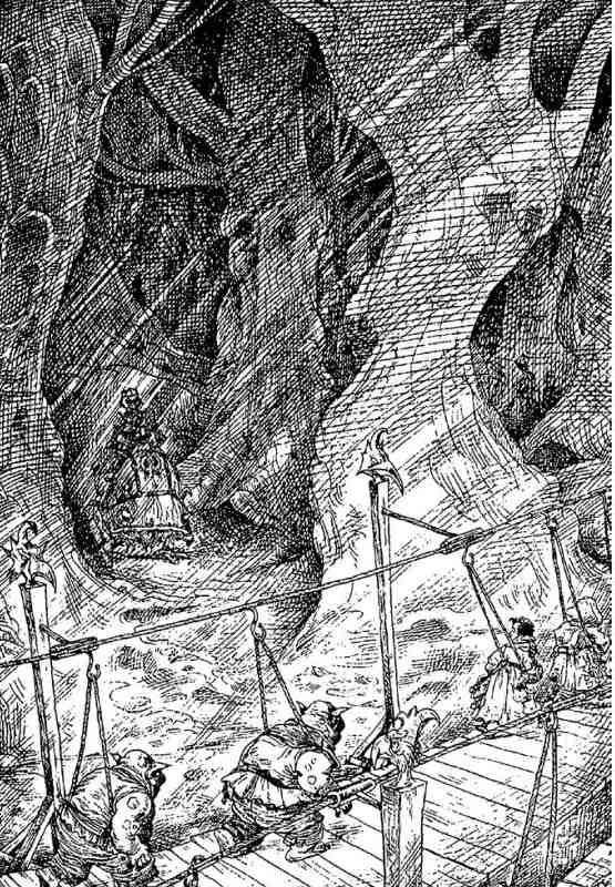 Из постовой будки вышли гоблины-утконосы: у каждого в руках было по куску каната. Гоблины должны были пропустить канат через петлю и затем оба конца закрепить на своих поясах.