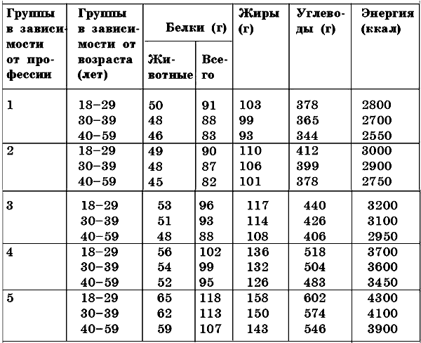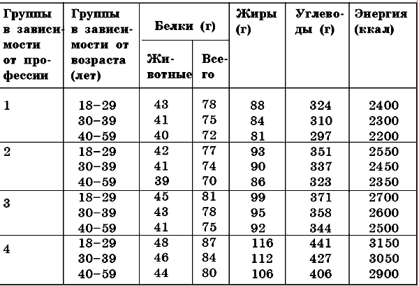 В отношении возрастных категорий существует разделение на три группы: 18–29, 30–39 и 40–59 лет. При этом учитывается средняя масса тела для мужчин и женщин отдельно. Средняя масса тела мужчин – 70 кг, женщин – 60 кг.