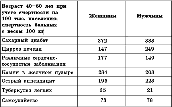 При стабильном ожирении и умеренном избытке веса больные долгое время остаются достаточно энергичными, подвижными и работоспособными. Если же ожирение развивается довольно быстро, то больной стремительно утрачивает работоспособность, в итоге приобретая раннюю инвалидность. Прогрессирующее ожирение провоцирует преждевременное старение организма: рано появляются и развиваются атеросклероз, сердечно-сосудистые заболевания, болезни печени, может возникнуть сахарный диабет и прочие серьезные заболевания. По данным медицинских исследований, ранняя смертность наблюдается чаще у тучных людей, чем у людей с нормальным весом. Средняя продолжительность жизни при ожирении сокращается примерно на 7 лет. Смертность у больных ожирением в связи с другими заболевания на 50% выше, чем у людей с нормальной комплекцией (табл. 1).