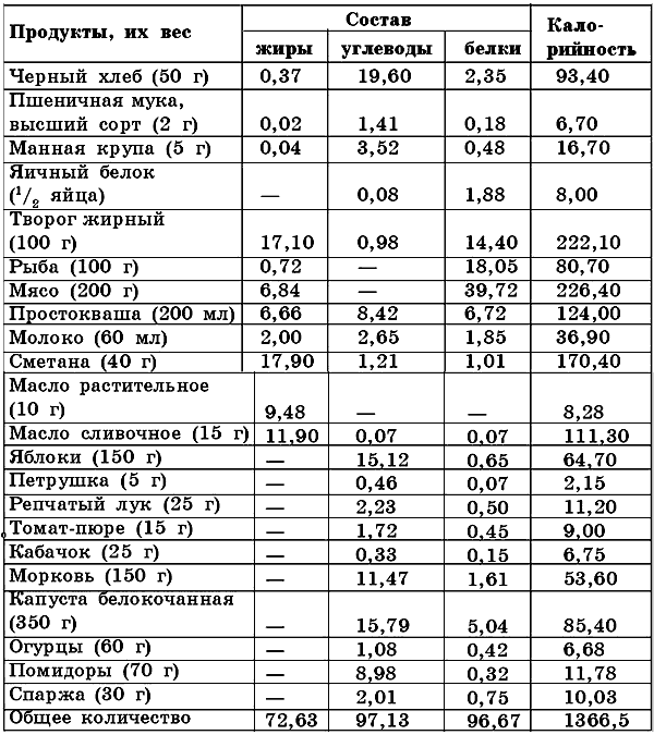 Суточное меню, состоящее из рекомендуемых блюд и продуктов, может быть следующим.