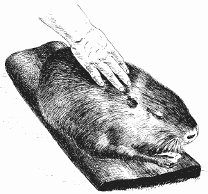 Точных методов определения ранних сроков беременности у нутрий пока не существует. Однако опытные звероводы, наблюдая за поведением самки и за состоянием ее сосков, способны с уверенностью сказать, беременна она или нет, уже через 2–3 недели после ее покрытия самцом. И хотя живот нутрии начинает округляться только на 12-13-й неделе беременности, специалист может установить беременность нутрии прощупыванием уже через месяц после ее оплодотворения. Для этого надо поставить животное на твердую поверхность (крышку домика или стол) (рис. 20), подвести руку между задними лапами под брюшко до грудной клетки. Затем движениями пальцев надо аккуратно прощупать брюшную полость нутрии, медленно продвигая руку к задней части туловища животного.