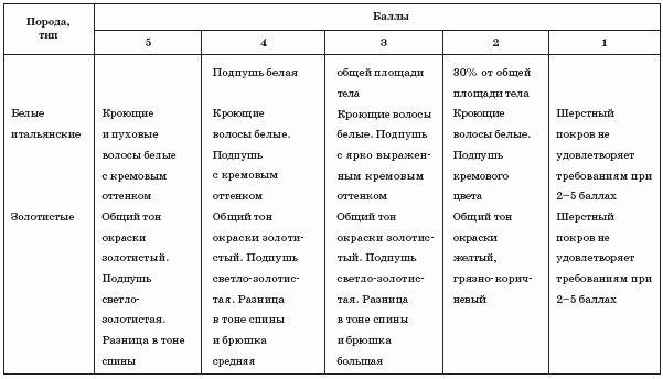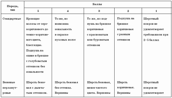 Довольно сложно оценивать у нутрий качество шерстного покрова. Дело в том, что этот сложный признак является совокупностью более простых. Больше всего ценятся нутрии с уравненным по высоте густым шерстным покровом, с хорошо опушенной областью паха. Как уже говорилось, качество шерсти оценивается у нутрий по 5-балльной шкале (табл. 15).