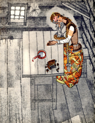 Кинул петух рыжего мужичка на пол, только собрался клюнуть его покрепче, как рыжий мужичок вскочил, кинулся к Маше: