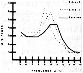Спектры мощности для группы Сильва: базовая линия (baseline), график альфа-частоты (Silva-1) и эффект биогенной обратной связи (Silva-f).