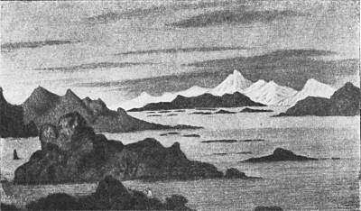 Стояли пасмурные дни. Часто шел дождь. Горы были окутаны туманом. Когда завеса тумана прорывалась, с кораблей были видны черные заливы, остроконечные скалы, темно-зеленые массивы лесов, голубые ледники и белоснежные вершины гор.