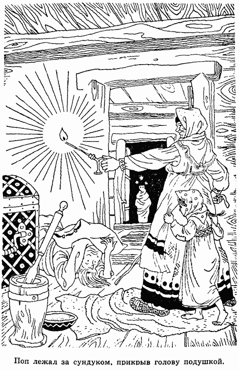 — Дом из-за тебя спалят! — крикнула она, врываясь в опочивальню. Одним рывком попадья вытащила попа из-за сундука: — Иди, Парамоша!