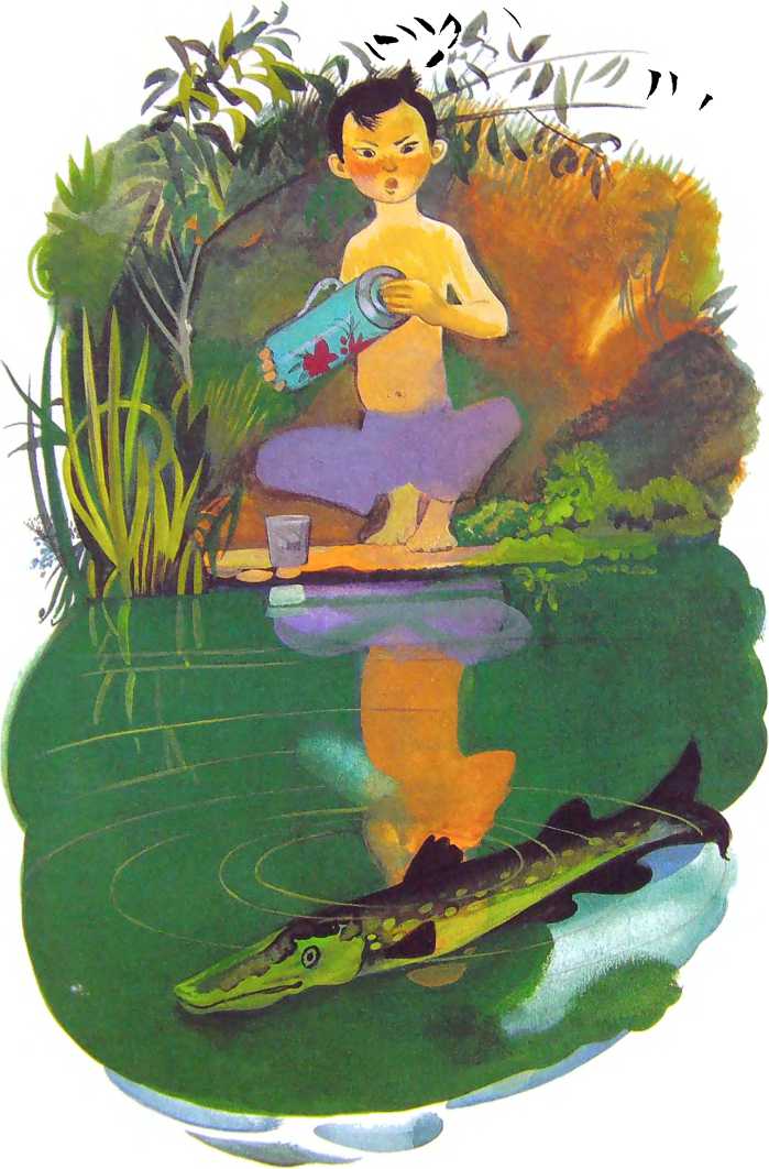Торопясь, мальчик погружает термос в реку и с восторгом слушает, как наперегонки лопаются пузыри воздуха и вода, одушевлённо звуча, проталкивается в посудину.