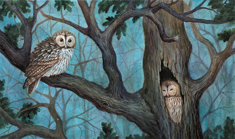 И всё-таки маленькие птички остались жить рядом с совиным дуплом. По ночам они забирались в своё гнездо, прикрывали собой птенчиков и дрожали от страха при каждом крике голодных совят.