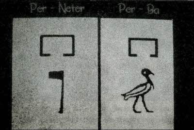 Следующее выражение, Пер-Ба, в переводе означает «Дом Души или Духа», или храм, место для молитвы, медитации, хорового пения и проведения ритуалов — практик, цель которых освободить и поднять сознание на недосягаемую высоту. В хемитийской истории Пер-Ба появляется очень рано, и старейшие из этих сооружений все еще покоятся под слоем песков в Египте. Хаким приводит исчерпывающие объяснения происхождения храмов, которые уходят в далекую доисторическую эпоху. Местом возникновения каждого храма становился участок земли, обычно имеющий источник кристально чистой, проточной воды. На алтарь, как правило, водружались несколько камней, обязательно кристаллических по структуре, а сам алтарь сооружался из камня вулканического происхождения (гранита, базальта или алебастра). Такой участок земли превращался в «первоначальное» священное место, где проточная вода и кристалл создавали активное энергетическое поле. Сюда приходили люди, чтобы «воспарить», испытать измененные состояния сознания, пообщаться с Богом. Такое место сначала считалось святая святых и поначалу было доступно для всех желающих. Впоследствии, в конце доисторического периода или в самом начале исторического, на нем возводились стены, дворики, пилоны и ворота, и таким образом рождался Пер-Ба, храм.