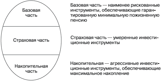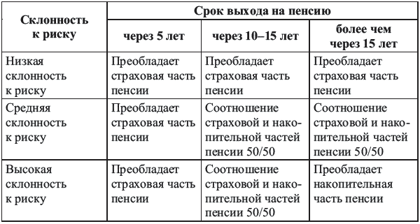 Таблица 10. Варианты соотношения страховой и накопительной частей негосударственной пенсии в зависимости от склонности к риску и сроке выхода на пенсию