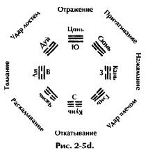 Отражение, откатывание, нажимание и толкание соответствуют югу, северу, западу и востоку. Поэтому их называют Четырьмя Направлениями (сы чжэн). Притягивание, раскалывание, удар локтем и плечом расположены соответственно на юго-востоке, северо-западе, юго-западе и северо-востоке и называются Четырьмя Углами (сы юй). Более детальное описание Восьми Ворот см. в шестой главе.