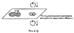 В первый момент, когда яблоко соприкоснется с плоскостью, тень увидит точку соприкосновения. По мере падения яблока сквозь плоскость тень будет видеть сначала увеличивающийся, а потом уменьшающийся круг, который в конце концов сжимается в точку, а потом исчезает и точка (см. рис. 2-5i).