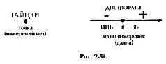 Каков смысл четвертого измерения? С геометрической точки зрения, точка не имеет измерений. Но все во Вселенной, да и сама Вселенная – это набор точек. В сущности, точка есть Тайцзи. У прямой линии только одно измерение – ее длина. Но направленная прямая (математическая ось) имеет положительное и отрицательное направления, представляющие Две Формы, Инь и Ян (см. рис. 2-5f).
