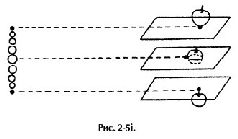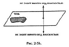 Давайте теперь мы, жители трехмерного мира, заглянем в мир двухмерный и попробуем осознать сущность и различие измерений. Например, у тени есть длина и ширина, но нет толщины, и она является полноправным представителем двухмерного мира. Представим себе, что тень может думать и чувствовать, как и мы. Что же будет думать и чувствовать эта тень о яблоке, падающем с дерева? Поскольку у нее нет чувства, воспринимающего высоту, тень не будет ничего знать о яблоке, пока оно не достигнет плоскости, в которой существует тень, и после того, как оно уйдет из этой плоскости дальше вниз. Другими словами, тень воспринимает только пересечение яблока с плоскостью существования тени (см. рис. 2-5h).