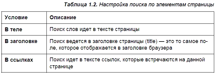 При обычном поиске заданные в запросе слова разыскиваются по всем элементам страницы (табл. 1.2). В данном контексте под элементами понимаются тело страницы, ее заголовок (тот текст, который виден в заголовке браузера), либо ссылки, ведущие со страницы. Вы можете ограничить ареал поиска, выбрав один из перечисленных элементов. И более того, вы можете ужесточить поиск среди ссылок, если в качестве дополнительного параметра укажете, на какой конкретно сайт должна вести ссылка. Это может пригодиться в том случае, если вы знаете сайт, информации на котором вы доверяете. И если в процессе поиска в тексте документа будут ссылки на информацию с этого сайта, вы заранее предполагаете, что сможете доверять и найденной информации.